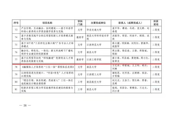 此次获奖体现了该校在创新创业人才培养、专业建设、课程改革等方面所取得的显著成绩,标志着该校省级教学成果奖实现零的突破,江西工程学院一流专业、一流课程、一流教学成果 “三个一流”建设迈出历史性步伐。