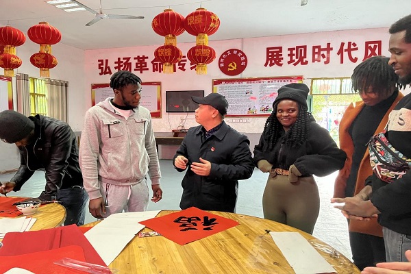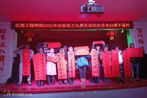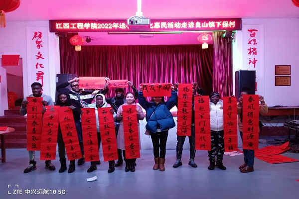 2021年新春佳节来临之际,为让外国留学生感受中国新春佳节的喜庆,丰富春节期间留校学生文化生活,体验中国浓浓的年味,进一步弘扬中华优秀传统文化。1月23日,江西工程学院“新春添年味,笔墨送祝福”——寒假留学生送春联迎新春活动在新余市良山镇下保村举行。参加此次志愿活动的有江西工程学院党委委员、宣传部长于永清,图书馆副馆长况卫华,国际交流学院副院长胡丽珍等教师以及学校来自赞比亚、卢旺达、布隆迪等国家9名留学生。