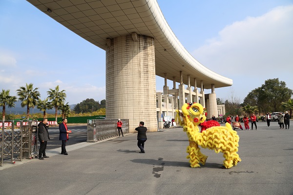 9:18,舞狮队来到学校行政楼前。在一派喜庆欢乐的气氛中,杨名权宣布舞狮表演开始。祥狮在礼炮声中起舞欢腾,生龙活虎,舞出了江工的精气神,舞出了虎年的新气象,增添喜庆之余,也为学校新春开学赋予吉祥如意、红红火火的美好寓意。
