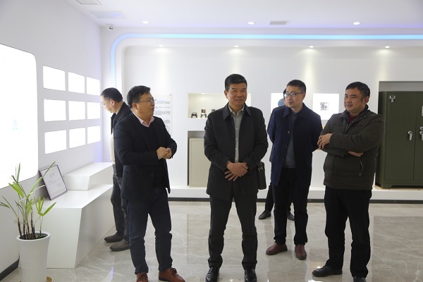 在易海平的带领下,杨名权一行来到指芯科技展厅,参观了指芯科技在应用层、平台层、通讯层、硬件层等方面的应用,了解了指芯科技从算法、芯片、终端、云端的发展历程。