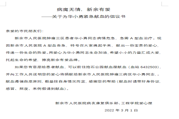 2022年3月2日,江西工程学院公寓团工委了解到以上信息后立即发布通知,号召团学干部们自愿参加,大家积极响应。次日下午,公寓团工委组织志愿者前往新余市中心血站。