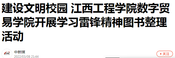 三月春风暖人间,雷锋精神代代传。为大力传承和弘扬雷锋精神,推进学院“学雷锋”系列活动的开展,引导广大学生积极参与青年志愿活动,培育和践行社会主义核心价值观,江西工程学院数字贸易学院青歌志愿团服务队于2022年3月7日晚6点半在校图书馆开展为期5天的“学习雷锋精神图书整理”主题活动。