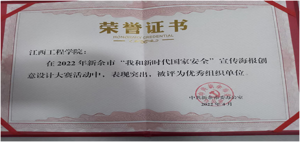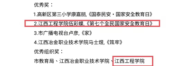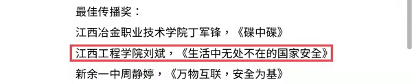 从此次大赛获奖名单的通报中获悉,在短视频创作比赛项目中,我校工商管理学院大学生刘斌(组织班级集体)创作的作品《生活中无处不在的国家安全》获最佳传播奖;在宣传海报比赛项目中,我校数字贸易学院大学生伍彩蝶的作品《第七个全民国家安全教育日》获优秀奖;同时,江西工程学院获优秀组织奖。