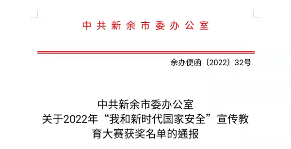 在今年第七个“4.15”全民国家安全教育日来临之际,为深入展示新时代国家安全事业发展新气象,增强广大干部群众和师生的国家安全意识,2022年3月,新余市委办公室举办了全市“我和新时代国家安全”宣传教育大赛活动,组织开展了短视频创作、宣传海报、宣讲比赛三项活动。经评委认真评选,共评选出各类奖项35个。