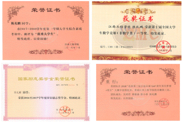 据土木工程学院老师们介绍,2016年陈礼鹏进校时,成绩并没有优势,但他在江工求学几年间,刻苦学习,虚心求教,在校期间,他担任过书法社社长,获得全国数学竞赛江西赛区一等奖;校简历设计大赛一等奖; 校优秀大学生; 校优秀共青团干部; SAP大赛三等奖;2016至2017学年度、2017至2018学年度获得国家励志奖学金。