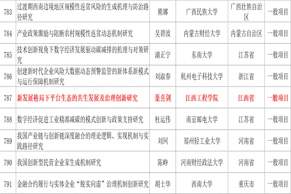 9月13日,全国哲学社会科学工作办公室公示了2022年国家社科基金年度项目和青年项目立项名单、2022年国家社会科学基金西部项目立项名单。江西省共有23个单位获得立项。我校教师巢喜剑申报的《新发展格局下平台生态的共生发展及治理创新研究》获得立项,走在同类高校前列,为江西省排名做出了重要贡献。