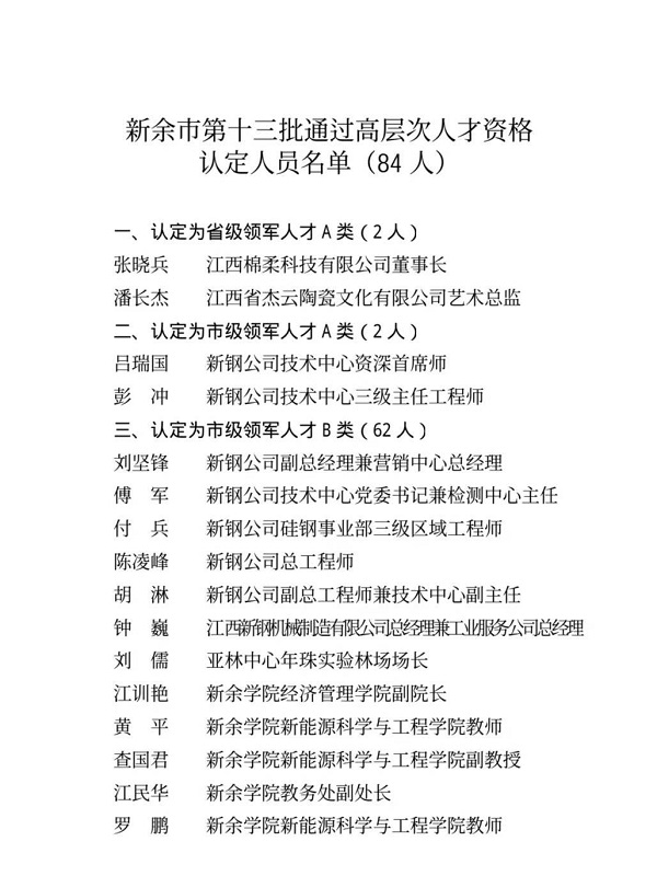 近日,中共新余市委人才工作领导小组公示了第十三批“新余市高层次人才”认定名单,张晓兵等84人为“新余市第十三批高层次人才”, 其中,江西工程学院副校长刘德华、数字贸易学院副院长张小红、智能制造与能源工程学院教授周平入选市级B类领军人才。