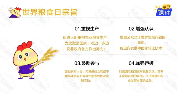 10月17日在江西工程学院仙女湖校区C栋教学楼515教室,马克思主义学院俞少华老师针对教育学院2021级小学教育本科1班的学生进行“世界粮食日”的宣讲。本次宣讲的主题是“不让任何人掉队。更好生产、更好营养、更好生活。”宣讲围绕习近平总书记关于保障粮食安全的重要论述以及粮食安全是“国之大者”进行了阐述,有助于大家进一步加深对粮食安全的理解;有助于大家进一步加深“要把中国人的饭碗牢牢端在中国人自己手中”的认识。