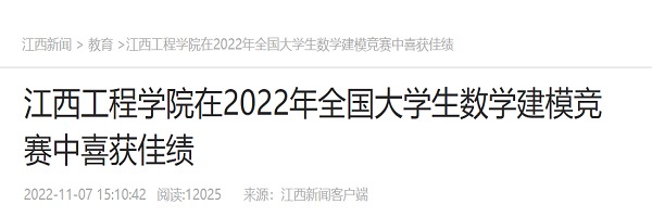 近日,2022年全国大学生数学建模竞赛公布获奖名单,江西工程学院获得本科组全国二等奖1项,江西省一等奖3项、二等奖9项、三等奖10项,是同类本科高校中唯一获得国家级奖项的高校。此次成绩的取得,成功体现出江西工程学院“四位一体”人才培养的良好成效。