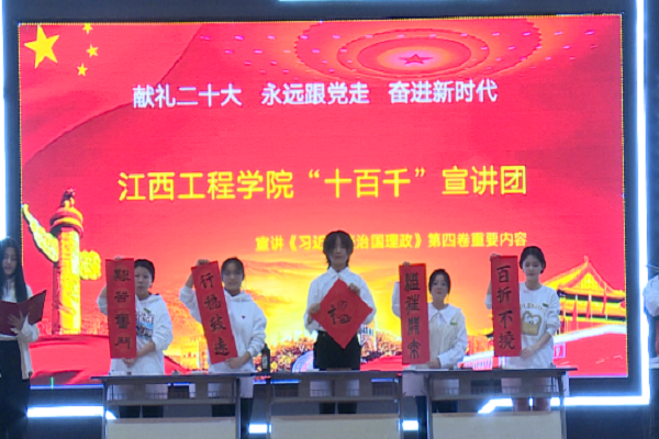 当好党的二十大精神传播者,让党的声音响彻学校内外。连日来,江西工程学院“十百千宣讲团”将宣讲行程安排得满满的,为师生群众面对面宣讲。10月中旬,学校第一时间出台了《江西工程学院学习宣传贯彻党的二十大精神总体安排实施工作方案》等文件,成立了党委书记、校长任组长的学习宣传工作领导小组。组建了学习宣传贯彻党的二十大精神“思政课教师宣讲团”“博士宣讲团”“辅导员宣讲团”“妇联宣讲团”“学生干部宣讲团”五支队伍,实现校内宣讲全覆盖。