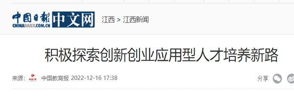 学校创新创业应用型人才培养受到政府部门及社会各界的充分肯定。学校先后两次接受江西教育电视台邀请作“双创”教育经验交流。《江西日报》以《奋力迈步在创新创业教育之路》为题对学校创新创业教育经验作了报道,多家主流媒体报道学校创新创业教育130余次。