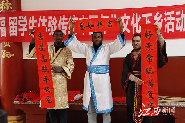 现场,江西工程学院志愿者、师生于永清、于兴远演奏了葫芦丝《有一个美丽的地方》和二胡《赛马曲》《战马奔腾》,让村民们听得如痴如醉,掌声和叫好声接连不断。随后,外国留学生们又为众人献上了一场中文朗诵,将全场气氛推向高潮。众人欢声笑语、齐聚一堂,共同庆祝即将到来的春节。