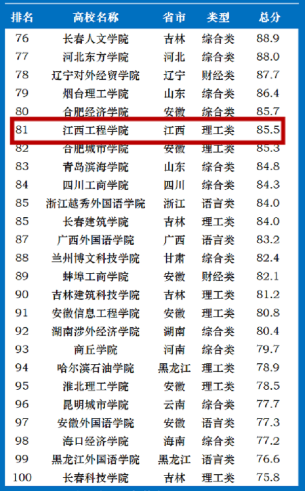 其中,江西工程学院以综合实力量化得分85.5分,排名第81位。