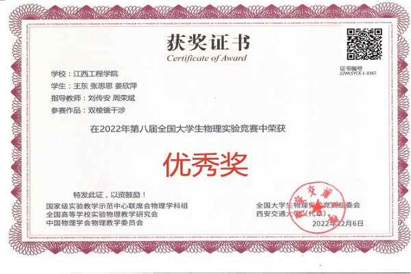 指导老师刘传安教授、周荣斌老师带领的学生团队王东、张思思、姜欣萍项目《双棱镜干涉》讲课类优秀奖。