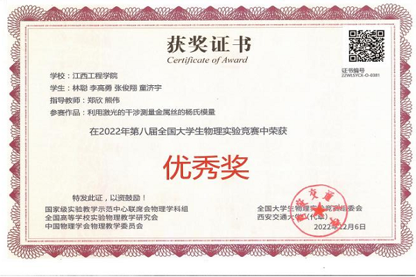 指导老师郑欣老师,熊伟老师带领的学生团队林聪,李高勇,张俊翔, 童济宇项目《利用激光的干涉测量金属丝的杨氏模量》获得自选课题类优秀奖。