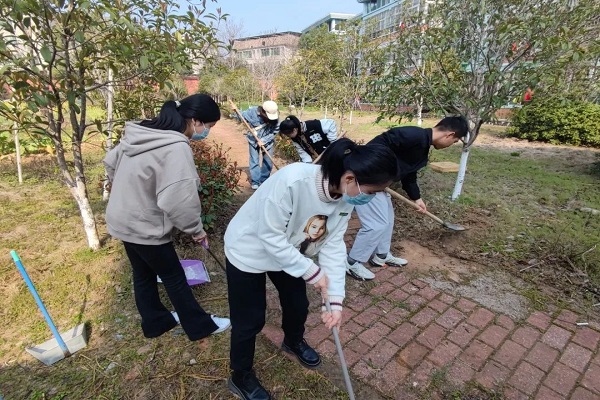 随后,大家拿起了扫把、铁锹等工具,帮助福利院清扫落叶和垃圾。
