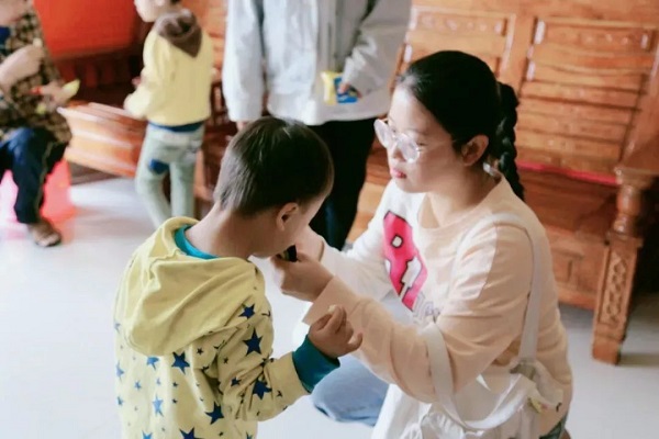 青年志愿者们给小朋友们分发水果和零食,并且和他们一起互动交流,愉快玩耍,其乐融融。