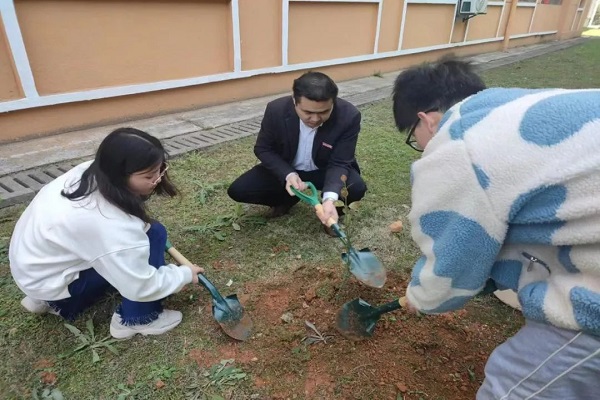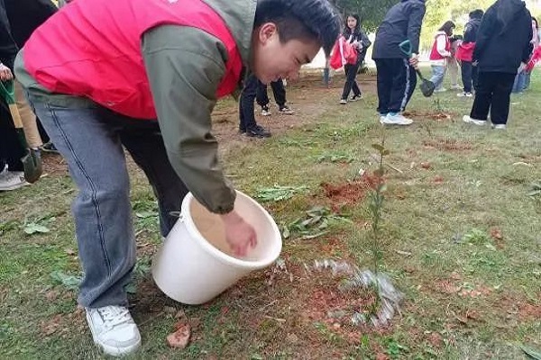 在植树活动现场,党总支书记范向红带领志愿者们拿着树苗、提着水桶、带上锄头、铲子等工具,发挥不怕苦、不怕脏的精神来到植树指定点,志愿者们身穿红色马甲,迅速投入到植树行动中。大家分工协作,你挖坑我填土,一棵棵小树种下,不仅仅饱含着同学们的热情,更是对绿色环保、植树造林理念的倡导,他们纷纷表示,在今后的学习和生活中,将自觉维护校园美好人文环境,传播卫生环保理念。