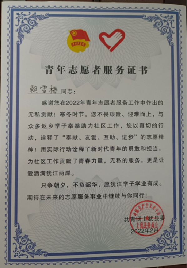 7.2022年寒假期间在青年志愿者抗击疫情服务工作中,荣获“青年志愿者服务证书”