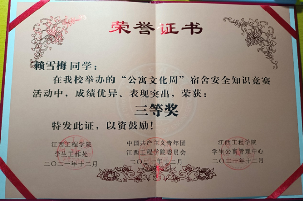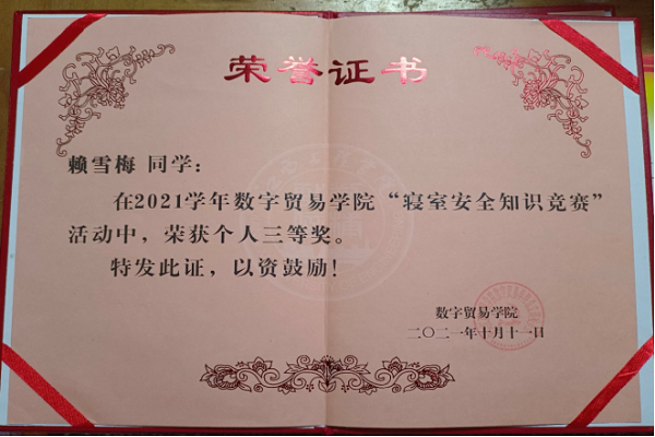 4.2021下半学年在全校“寝室安全知识竞赛”活动中,荣获个人三等奖