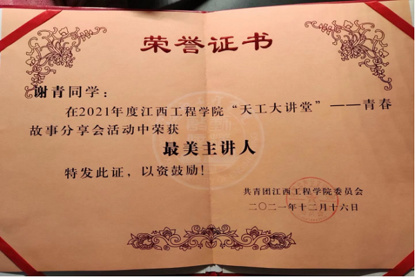 5.2021年度江西工程学院“天工大讲堂”——青春故事分享会活动中荣获“最美主讲人”