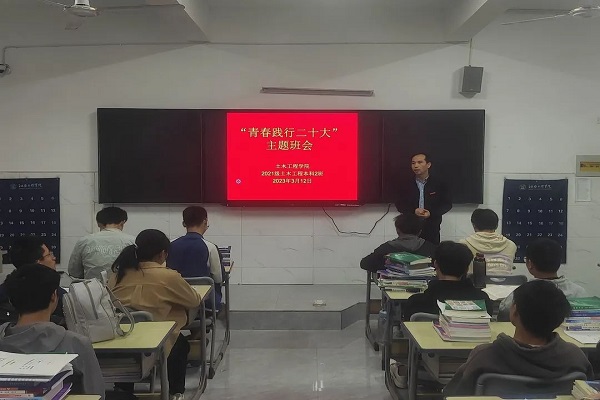为深入学习贯彻党的二十大精神,贯彻落实立德树人根本任务,加强大学生思想政治教育和日常管理,精准把握学生思想状况,帮助学生树立正确奋斗目标和人生航向。引导学生认真学习习近平新时代中国特色社会主义思想,学习党的二十大精神,坚定不移听党话、跟党走。土木工程学院于3月12日组织各班召开“青春践行二十大”主题班会,本次班会由各班辅导员组织开展。