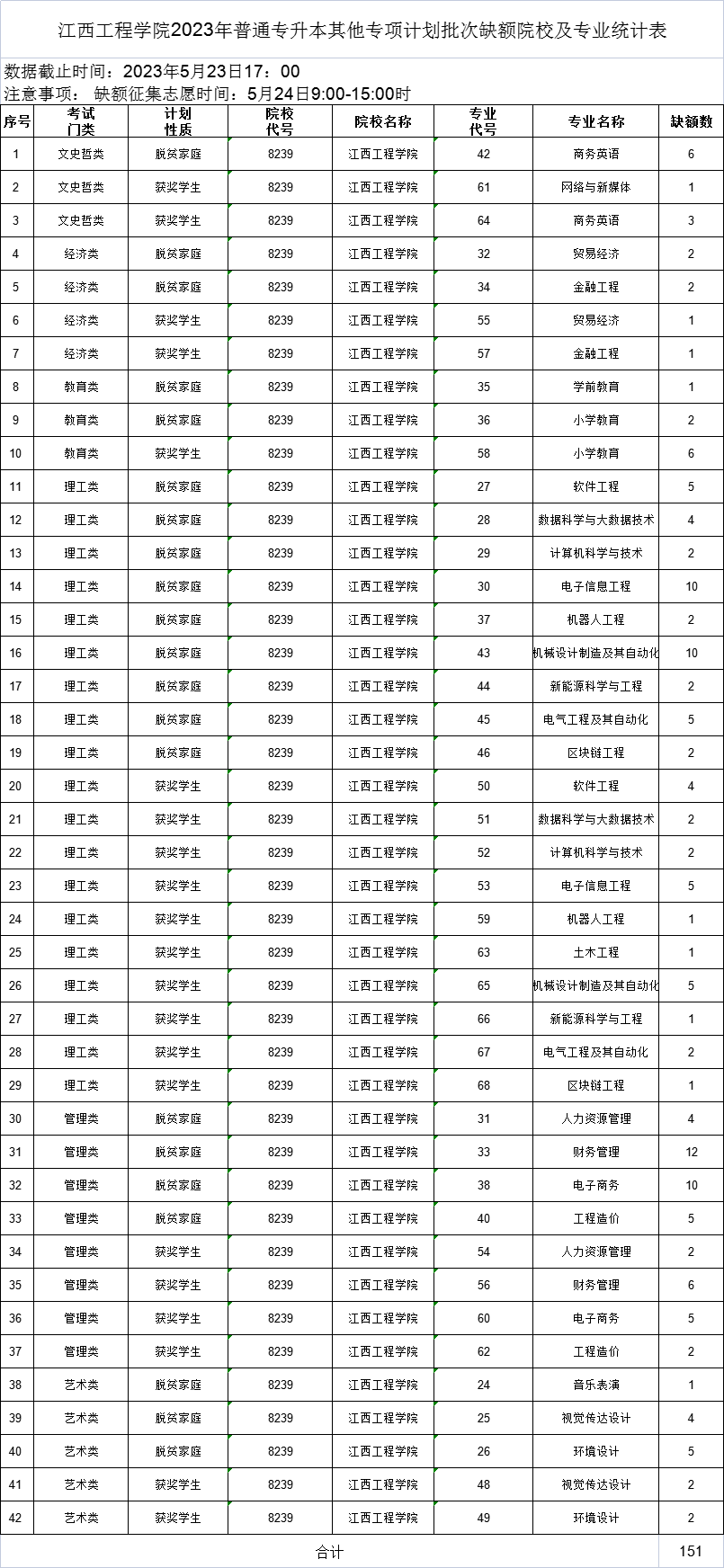 我校2023年专升本其他专项计划(脱贫家庭学生、获奖学生)经平行志愿投档录取后仍有部分缺额,将于5月24日9:00—15:00进行征集,现将相关事宜公告如下: