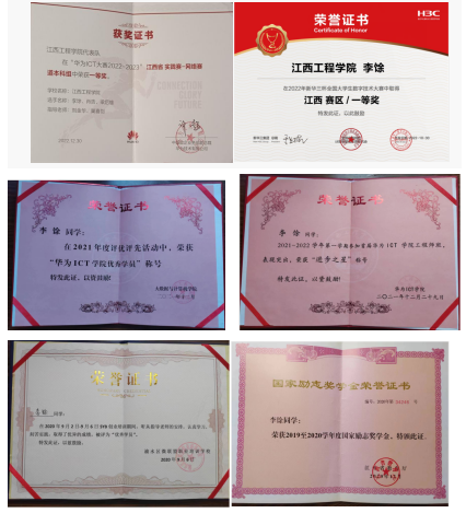 2019年9月,李馀深知作为一名大学生,大学期间最重要的任务是学习,刚入学期间,他就认真学习课内专业知识,课外学习专业技术提升专业能力。课内刻苦的学习也让他获得SYB创业培训评为优秀学员、学院最佳贡献奖、国家励志奖学金、华为工程班“进步之星”、“工程师班优秀学员”的称号。课外的时光,他也不忘积极参加相关的竞赛,曾获得2020年江西省信息技术大赛一等奖、2022年江西省新华三杯全国大学生数学技术大赛一等奖、2022年江西省实践大赛-网络赛道本科组一等奖,在这些比赛中不断提升自我,提高自己的专业素养。他知道学无止境,在大学的道路上需要不断学习,提升能力。