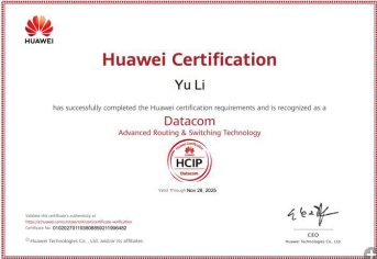 为了能进自己心目中的公司,李馀在大二、大三期间,刻苦学习专业课,积极参加网络类竞赛提升自己网络方面能力。2022年参加第一期华为ICT工程师班。在华为工程师班期间,他每天早早到实验室,每天上午认真听课、下午操作实验、晚上做项目,学习专业技术,看博客,拓展自己的专业知识面以努力理想的要求。经过三个月努力地学习,他成功取得HCIP工程证。