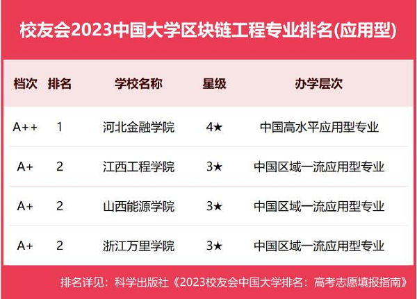 近日,由全国第三方大学评价机构艾瑞深校友会网(Cuaa.Net)撰写完成、科学出版社正式出版发行的《2023校友会中国大学排名—高考志愿填报指南》发布了2023中国大学各专业类一流专业排名,最新发布了校友会2023中国大学区块链工程专业排名,我校区块链工程专业排名全国第二,评为A+级。