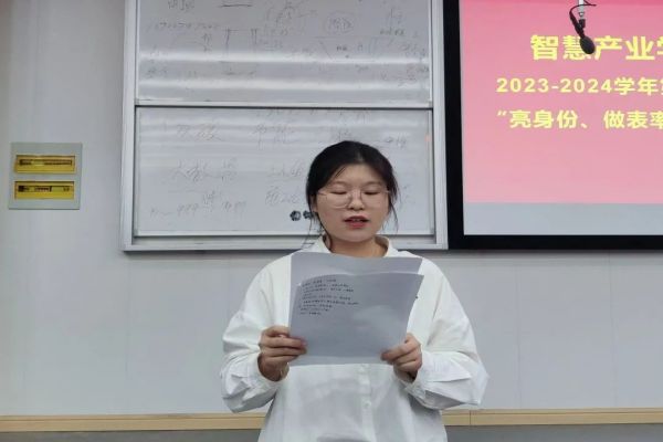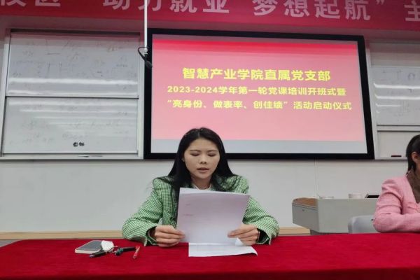 为深入学习贯彻习近平新时代中国特色社会主义思想主题教育和落实党的二十大精神,2023年10月8日晚,智慧产业学院直属党支部在C106召开2023-2024学年第一轮党课培训开班式暨“亮身份、做表率、创佳绩”活动启动仪式。此次大会由智慧产业学院直属党支部副书记张龙龙主持,党支部书记何丽、党支部专职组织员何艳霞、全体学生党员、入党积极分子、2023年入党申请人、学生骨干参加。