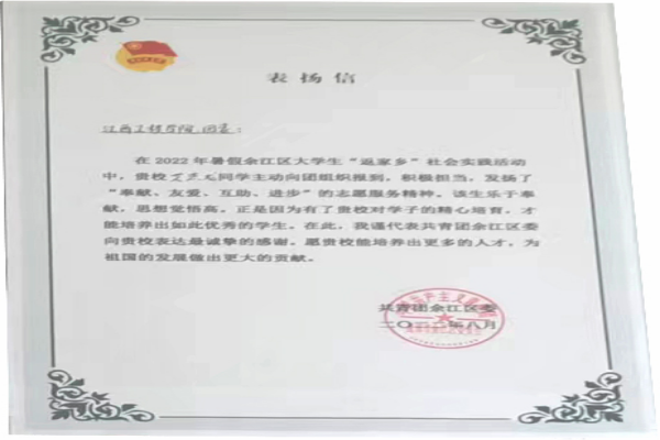 除了学习,他也充分意识到集体和社会活动的重要性,秉承初心,致力于德智体美劳全面发展。他加入了学校的吉他社,加入了学院的青歌服务队。学习之余,他多次参与服务队的志愿活动,曾参与义务植树、探望新余市儿童福利院小朋友、打扫孔目江湿地公园、参与钢丝厂社区志愿活动和捐赠活动等。在2022年疫情期间,他还积极参与家乡的防疫活动,被授予“鹰潭市余江区优秀志愿者”荣誉称号。
