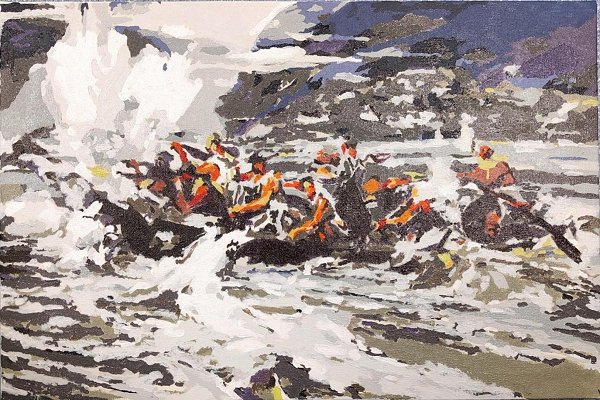 作品简介:此作品描绘红军抢占泸定桥的战斗场面,红军二十二名突击队员在全团火力掩护下冒着川军的密集火力攀踏铁索,向对岸冲击,当接近桥头时,川军突然施放火障,突击队勇敢地穿过火墙,迅速歼灭守桥之敌。桥头敌人点燃的烈火跃动着,给勇士们镀上了一层火红色。透过铁索的间隙,江水滔滔奔流,远处群山如削,构成险峻而壮观的奇景。飞夺泸定桥作为长征中的一场重要胜利,对于红军顺利通过大渡河,摆脱国民党军队围堵意义重大。