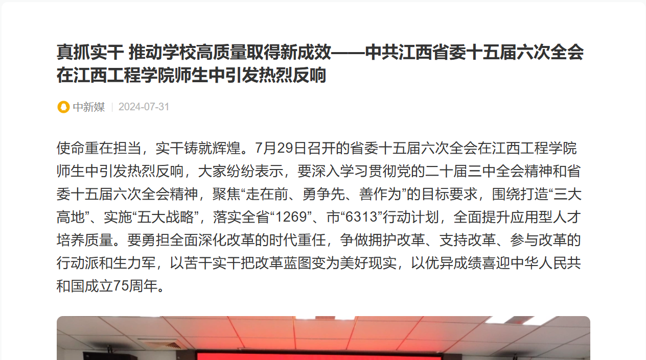 使命重在担当,实干铸就辉煌。7月29日召开的省委十五届六次全会在江西工程学院师生中引发热烈反响,大家纷纷表示,要深入学习贯彻党的二十届三中全会精神和省委十五届六次全会精神,聚焦“走在前、勇争先、善作为”的目标要求,围绕打造“三大高地”、实施“五大战略”,落实全省“1269”、市“6313”行动计划,全面提升应用型人才培养质量。要勇担全面深化改革的时代重任,争做拥护改革、支持改革、参与改革的行动派和生力军,以苦干实干把改革蓝图变为美好现实,以优异成绩喜迎中华人民共和国成立75周年。