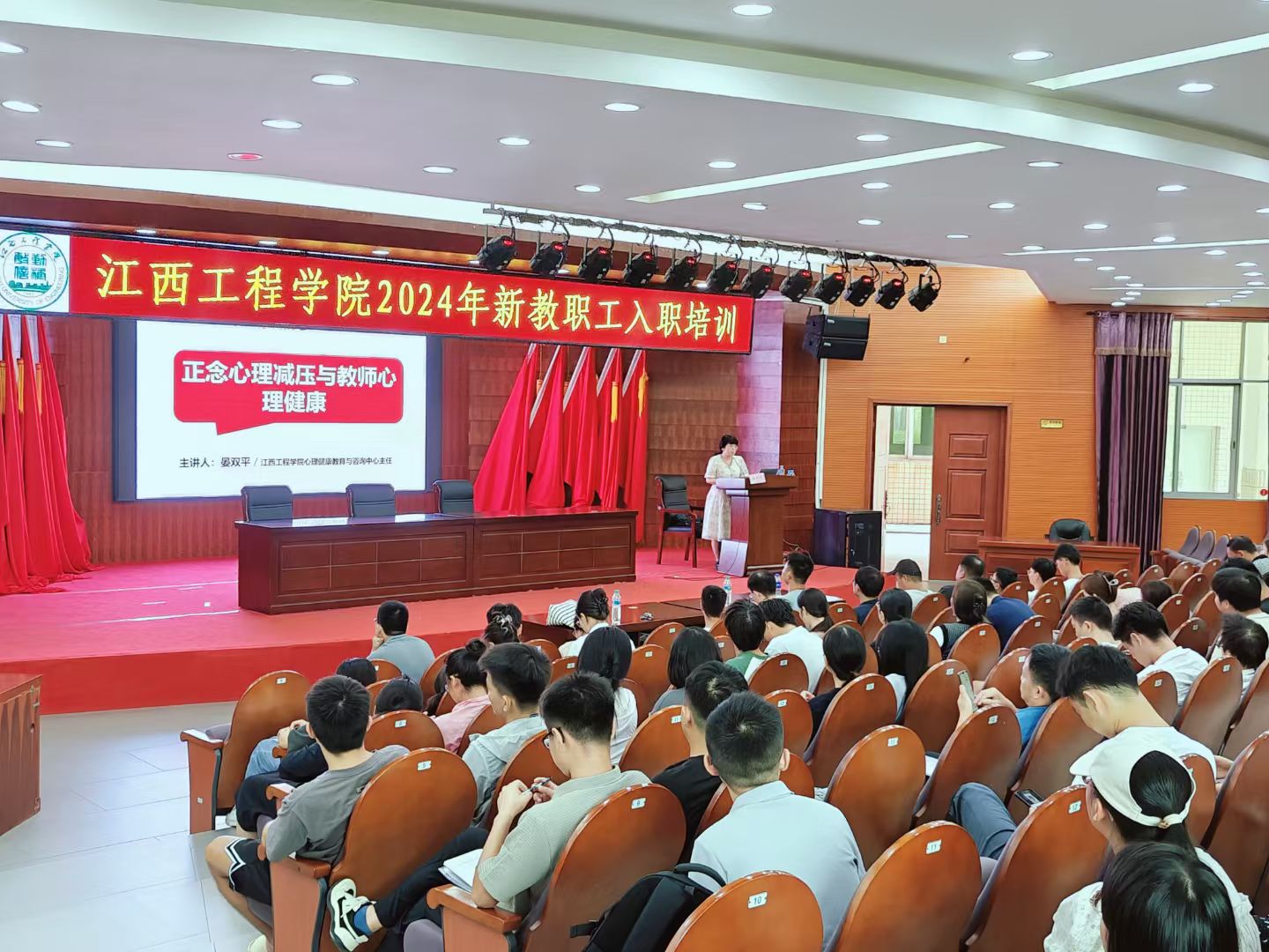 为适应新时期新形势下的教学工作,促进教师成长,提升师资队伍素质,2024年8月16日下午,我校在天工校区学术报告厅开展了以“正念心理减压与教师心理健康”为主题的培训讲座,旨在为新入职的教师们做一个新生入学后常见心理问题的普及,帮助他们提前了解学生们的心理状况,更加快速进入工作状态。本次讲座邀请了江西省“万师润万心”心理健康大行动讲师团成员、校心理健康教育与咨询中心主任晏双平老师主讲,全体新入职教师100余人聆听了本次讲座。