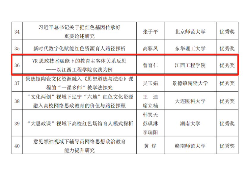 2025年4月10日至12日,由教育部日新卓越辅导员工作室、江西省高校辅导员培训与研究基地(赣南师范大学)等单位联合主办的2025年“数字思政”创新发展论坛在赣州圆满举行。江西工程学院马克思主义学院教师曾育仁凭借论文《VR思政技术赋能下的教育主客体关系反思——以江西工程学院实践为例》,从全国21个省94所高校的103篇投稿中脱颖而出,荣获优秀奖。这一成绩不仅彰显了学校在数字思政领域的创新探索成果,更为新时代思政教育改革提供了宝贵的江工经验。