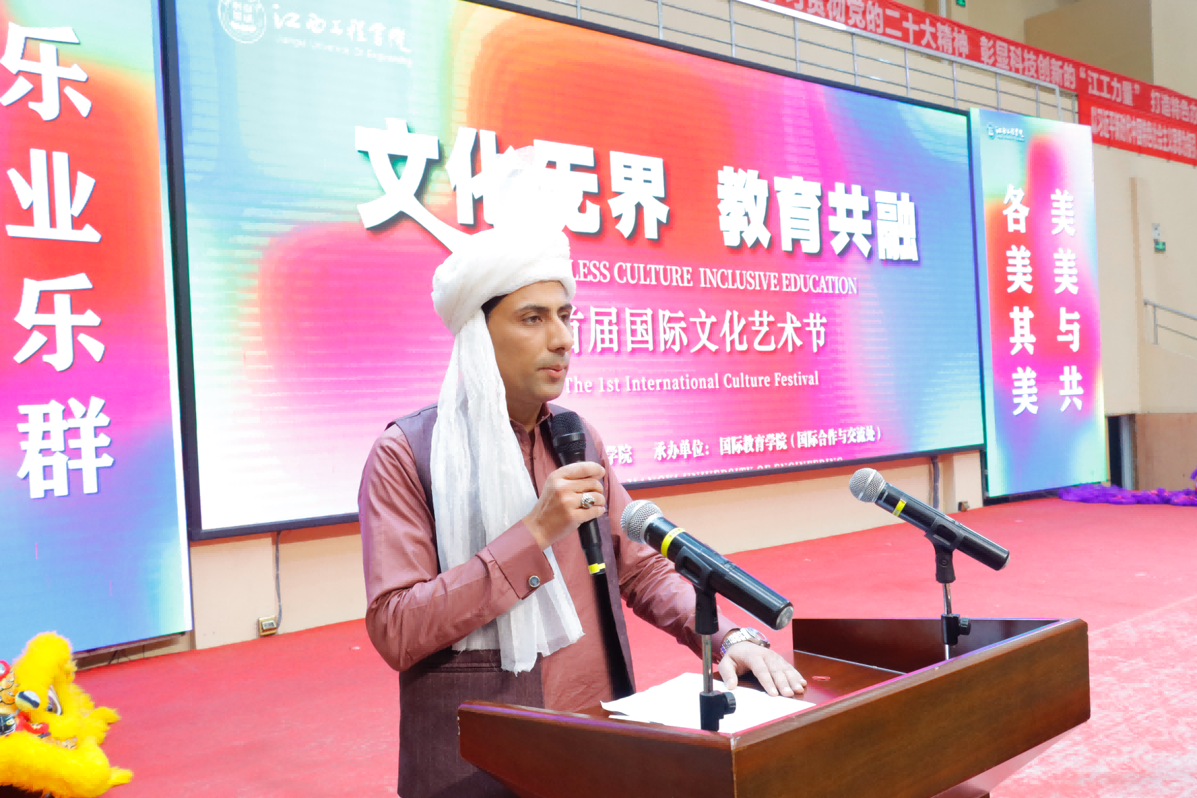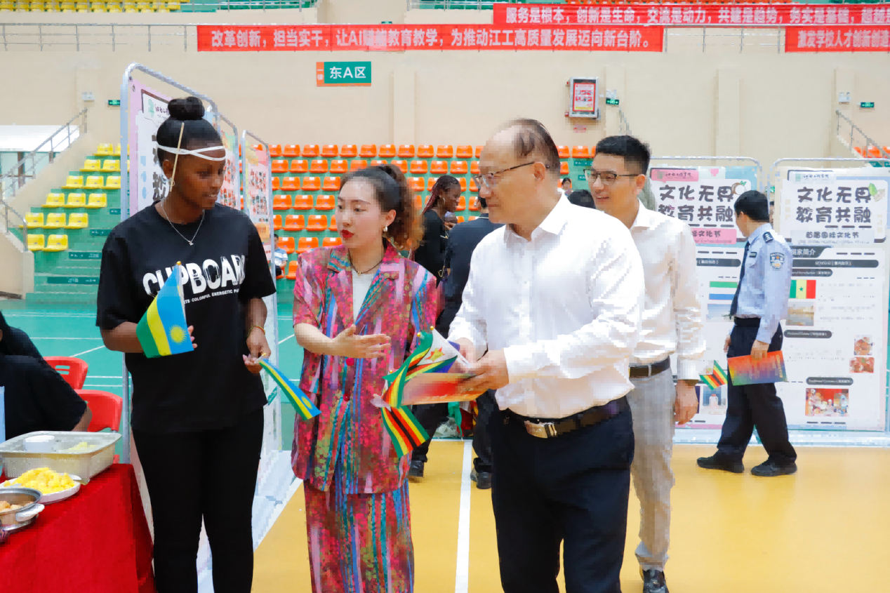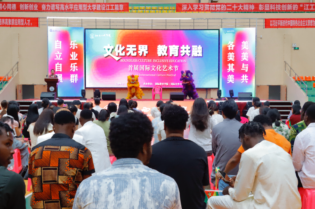 5月16日下午,江西工程学院天工校区体育馆内洋溢着欢乐的氛围,首届国际文化节在这里隆重举行。本次文化节以"文化无界 教育共融"为主题,吸引了来自30多个国家的180余名留学生参与,共同打造了一场精彩纷呈的文化盛宴。