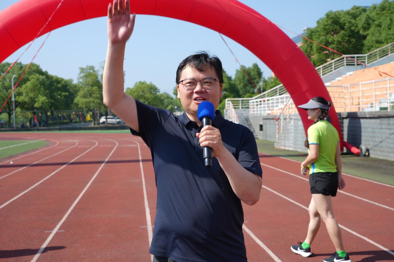 魏建克为“天工逐梦 共筑健康”教职工健身慢跑活动鸣枪发令。