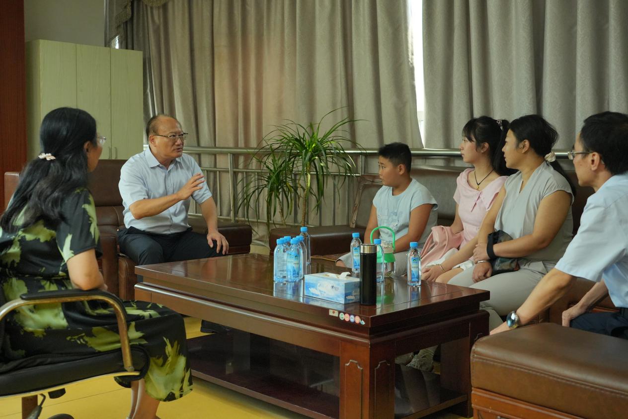 在校长办公室,党委副书记、校长刘新跃向刘雨昕及其家人、应正飞及其家人介绍了学校的优势和特色,解答家长关心的问题。“好学生的一个基本的内涵,就是‘好学’。”刘新跃指出,学校将价值塑造、能力培养、知识获取三者融为一体,努力为学生创造宽松自由的学习环境,提供内涵丰富的成长套餐,就是为了更好地培养和激发学生的创造性精神、创造性思维和创造性能力。希望你们在本科阶段打牢学习基础,提升实践能力,提升人文素养,开拓国际视野,积极拓展知识的宽度和面向,养成独立思考的能力,从创造性思考和批判性思考中发现科学问题。