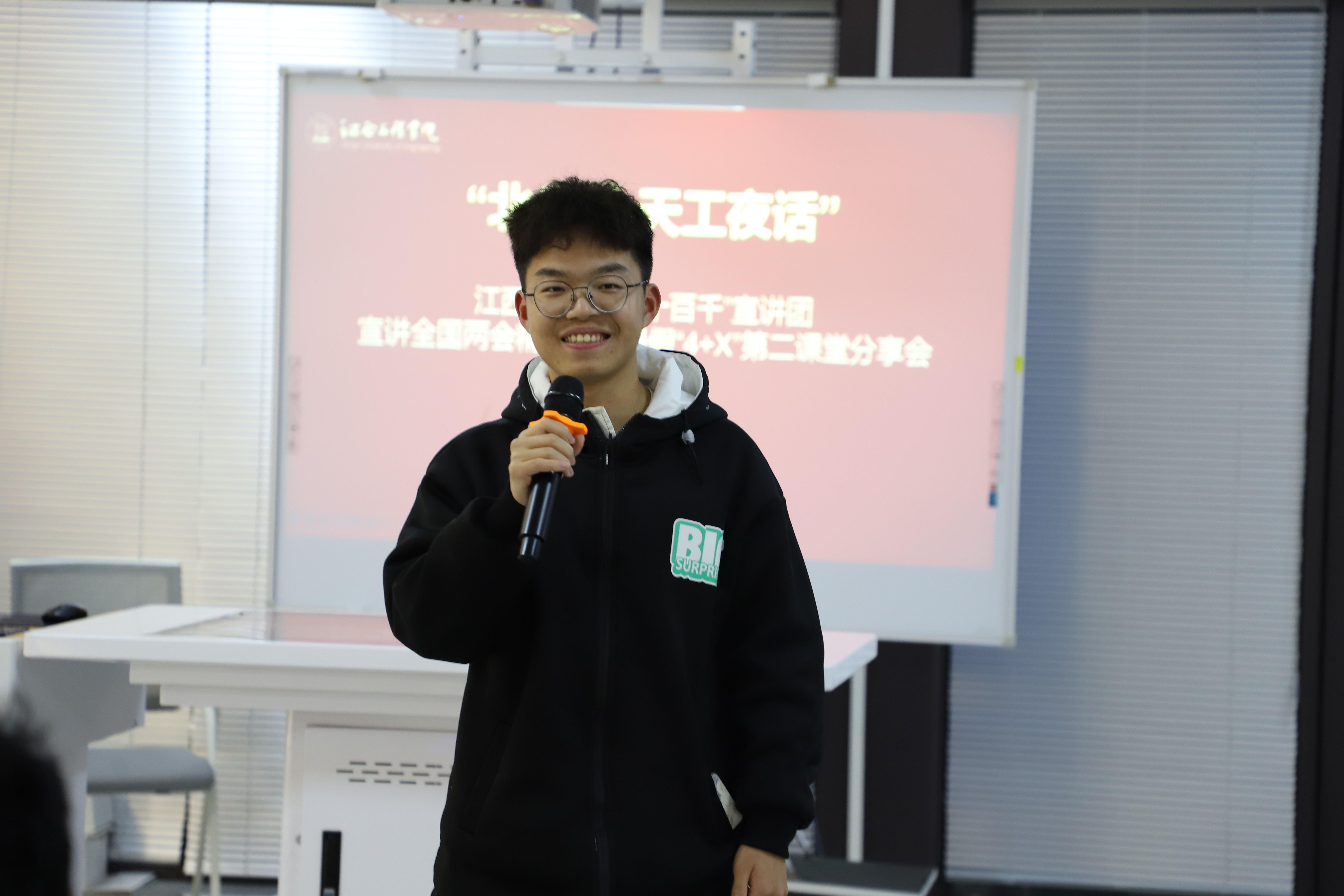 交流环节中,3名学生代表分享了寒假“4+X”实践的暖心成果与深刻感悟。25级自动化本科2班的时间同学动情讲述:“吃了无数次妈妈炒的辣椒炒蛋,这次自己系上围裙才懂其中深意,盐放多了的小插曲让我红了眼眶,父母却满口夸赞,这份包容与爱让我学会感恩。”25级自动化本科1班的李梦如分享了为小区流浪猫制作过冬小窝的经历:“虽然过程遇到困难,但能为弱小生命送去温暖,让我体会到责任与担当,感谢学校给我践行善意的契机。”2025级土木工程本科一班的谢雨豪则谈到:“‘4+X’任务没有固定答案,让我第一次认真思考与专业、父母、社会的关系,在漫长假期中收获了成长与沉淀。”真挚的分享引发全场共鸣,展现了江工学子在实践中涵养品德、锤炼本领的青春风采。