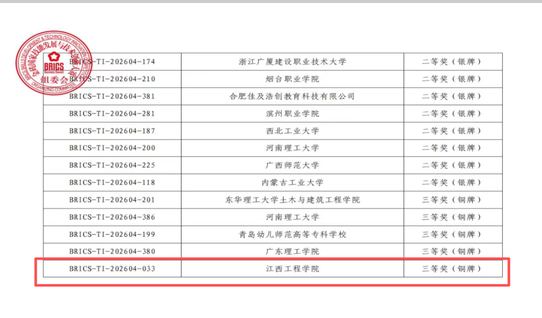 近日,2026年“一带一路”暨金砖国家技能发展与技术创新大赛之技术创新赛国内决赛在福建省厦门市圆满落幕。本次大赛自启动以来,共吸引561家单位报名参赛,涵盖西北工业大学、国防科技大学等国内顶尖高校代表队同台竞技,经过层层遴选,最终由江西工程学院人工智能与数据科学学院杨钧、王恒、陈凯、涂领先、胡紫萌五位同学组成的参赛团队,凭借扎实的专业功底、突出的实践创新能力和默契的团队协作,在众多强手中脱颖而出,成功斩获全国三等奖。