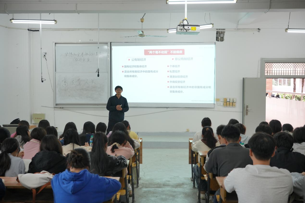 马克思主义学院李晋老师为100余名2024级经济管理学院本科生讲授《习近平新时代中国特色社会主义思想概论》课程。魏建克走进课堂,与大家一起认真听课。课后,魏建克与授课教师深入交谈,对教学内容的组织、教学方法的选择、重点难点的把握等方面进行探讨。