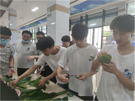 活动现场,淳淳的糯米香、棕香沁入心脾。一下课,师生们纷纷来到仙膳堂展开了其乐融融地包粽子活动。有经验的老师包地游刃有余,有棱有角,而第一次尝试包粽子的同学们屡屡出现漏米、包住这头,裹不住那头等情况,但在老师和饭堂工作人员的帮助下,同学们学会了拿捏粽叶的手法和捆绑稻草绳的方法,渐渐地一个个有模有样的家乡粽子陆续诞生了。从无到有,从匆忙到从容,学生们包得越来越得心应手,脸上也不由得露出藏不住的笑容和自豪。“纸上得来终觉浅,绝知此事要躬行。”
