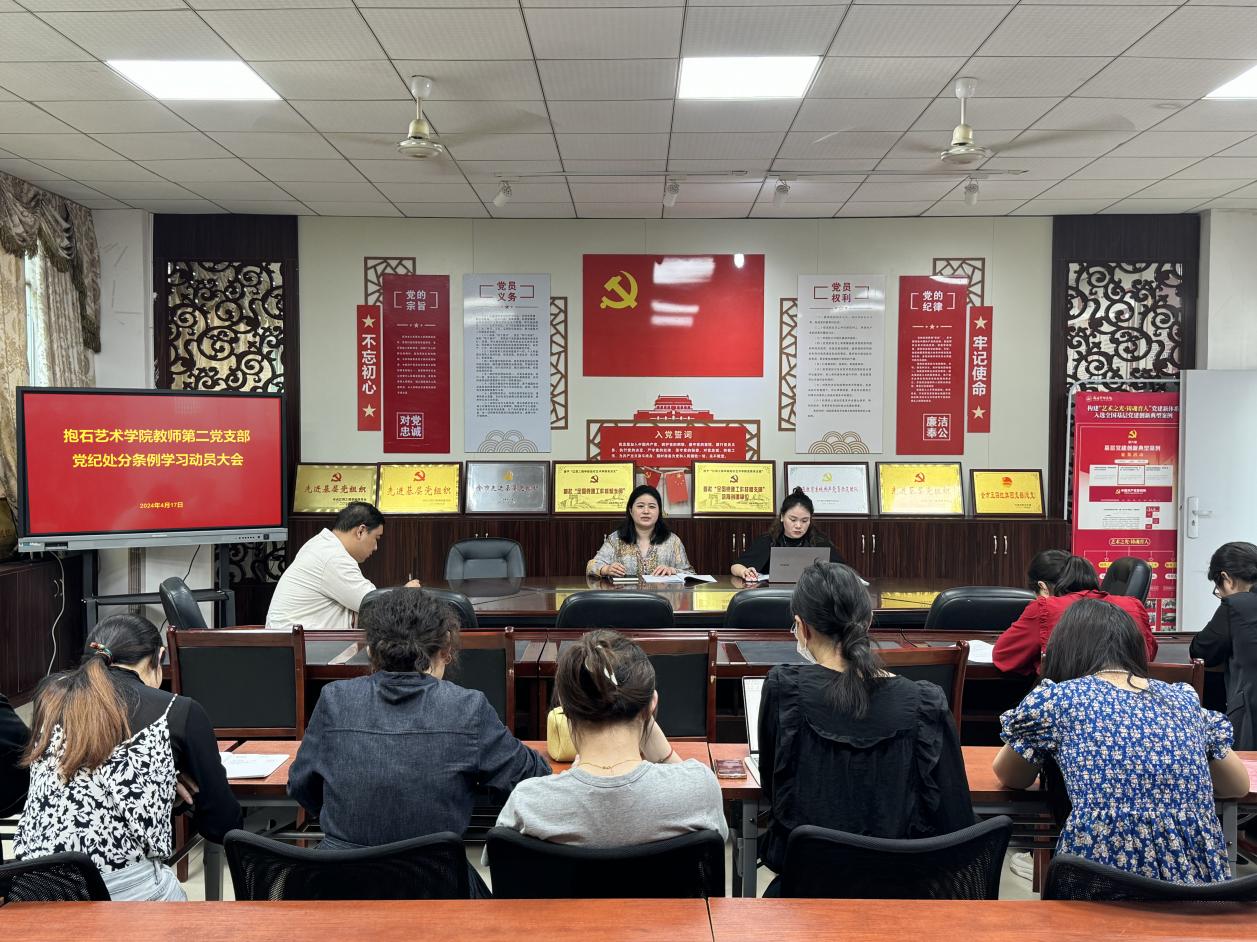 2024年4月10日14:30,抱石艺术学院教师第二党支部组织学习《中国共产党纪律处分条例》。全体支部党员教师齐聚一堂,共同开启这场重要的学习之旅。