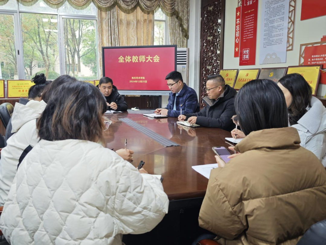 为全面总结本学期工作,落实期末及假期相关工作,2024年12月25日,抱石艺术学院在艺术楼202会议室召开了2024-2025学年期末工作大会。党总支书记张志胜、副院长王冬冬、党总支副书记姬赛赛以及全体教师参加了此次会议。