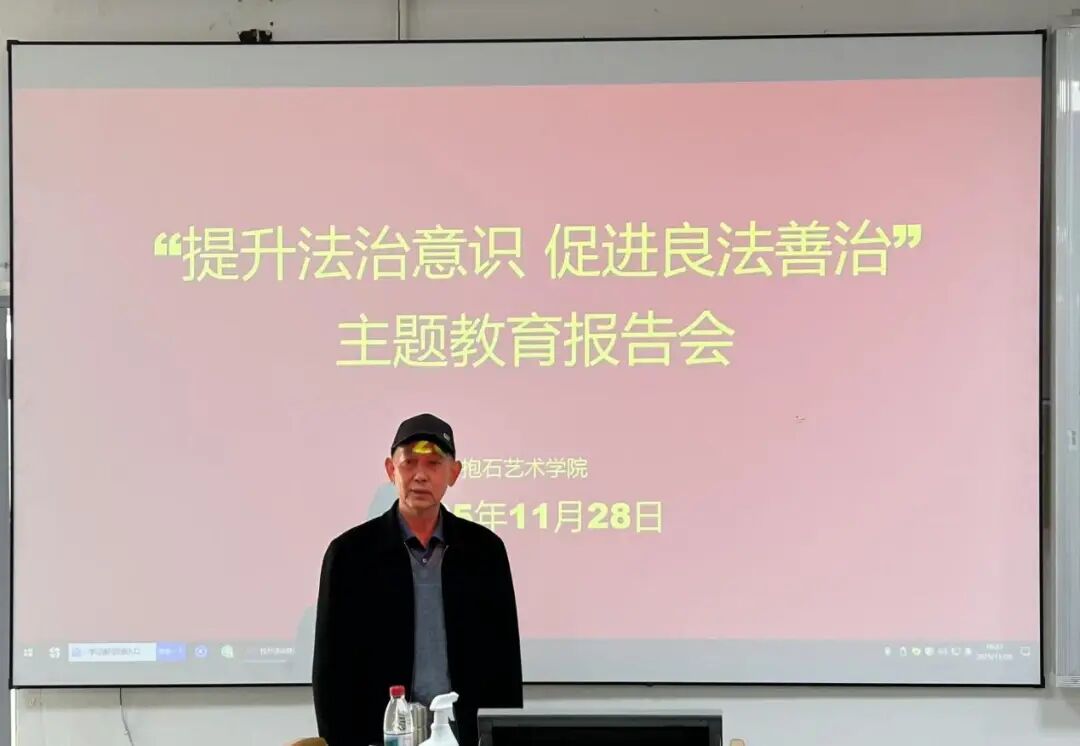 为进一步提升学生法治素养,引导青年学子树立正确法治观念,助力营造尊法学法守法用法的校园氛围,2025年11月28日下午4时,抱石艺术学院在艺术楼401教室举办“提升法治意识 促进良法善治”主题报告会。本次报告会特别邀请新余市关工委法治报告团团长肖显副担任主讲人,学院部分学生代表现场参会聆听,活动最后还举行了庄严的宪法宣誓仪式。