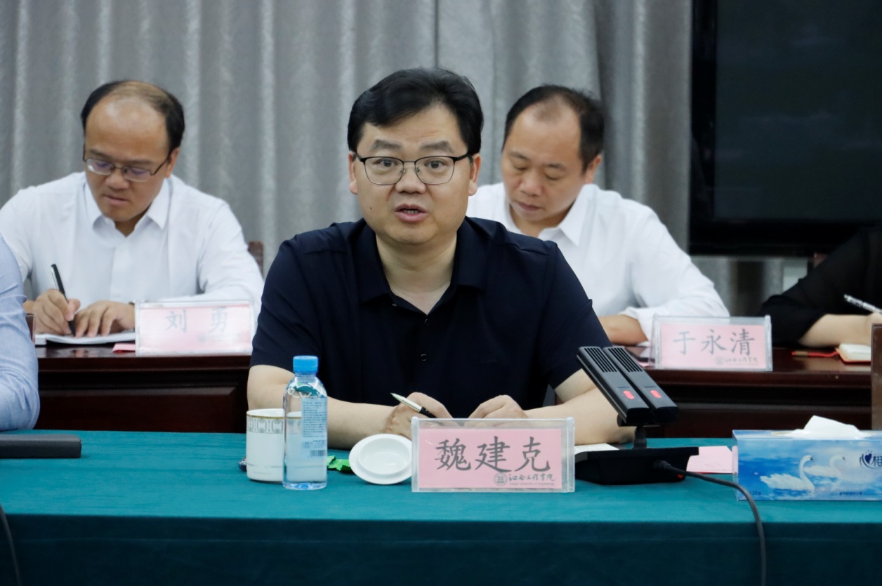 冯赟汇报了我校意识形态暨思想政治工作取得的成绩以及存在的问题和下一步工作打算。他指出,面对强国建设、民族复兴的时代要求,我们要切实筑牢意识形态安全防线,坚守宣传思想阵地,唱响江工故事,传播江工好声音,推动学校教育事业高质量发展。