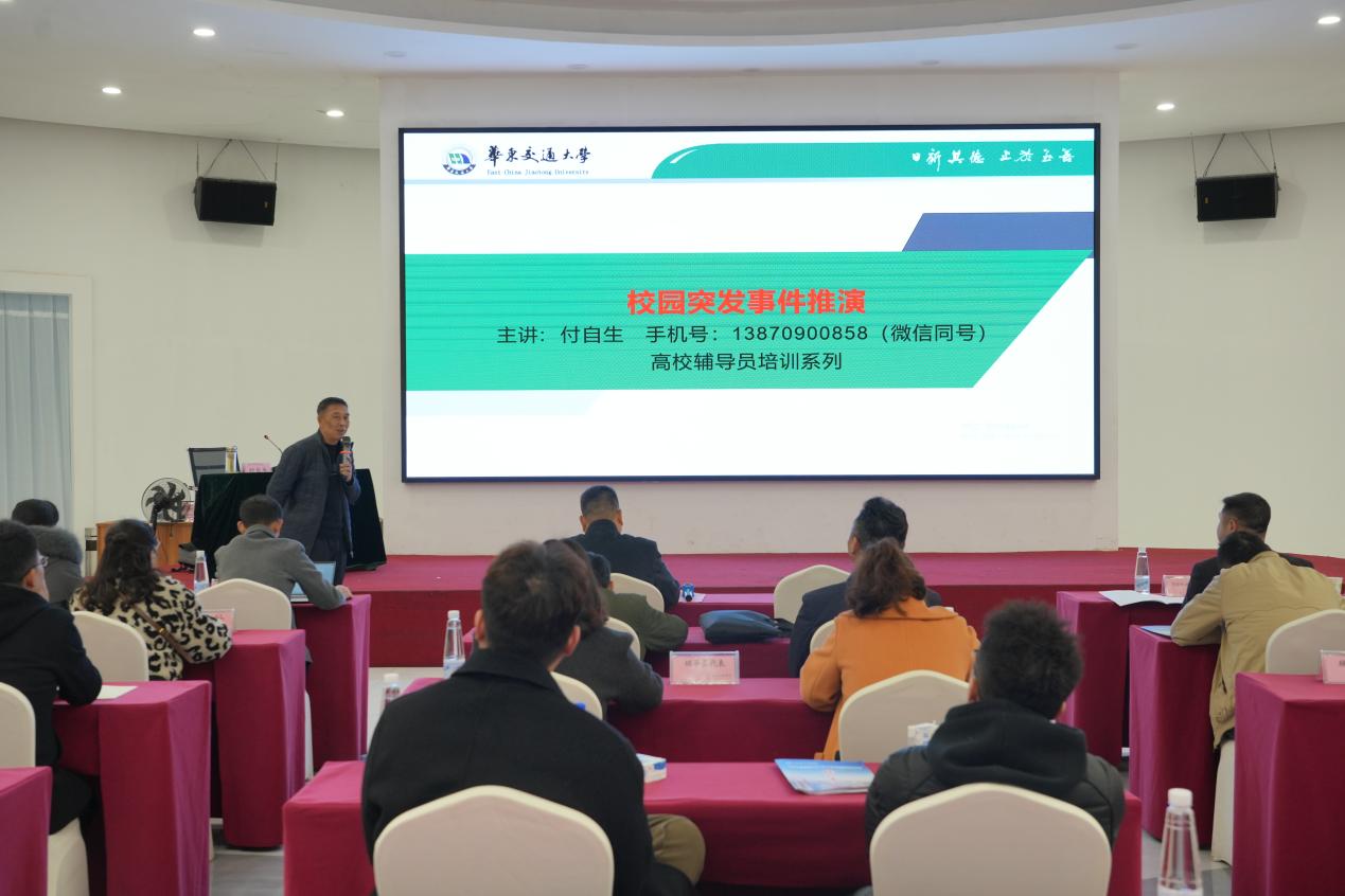 华东交通大学原保卫处处长付自生以《谱好学生突发事件应对与处置“三部曲”》为题,从平安校园建设的重要性入手,就突发事件前如何预防、突发事件中如何做到妥善以及突发事件处理后如何总结三个层面详细解读有关制度安排和工作要求,并结合真实案例分享学生突发事件预防与处置策略,为维护学生安全保障提供了理论与实践指导。