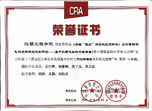 3、2023年“正大杯第十三届全国大学生市场调查与分析大赛本科组选拔赛”“一等奖”