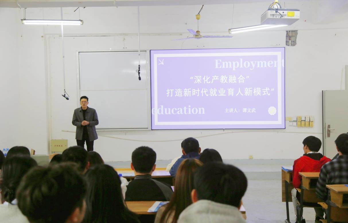 为深入学习贯彻习近平总书记关于就业工作的重要论述精神,全面落实党中央、国务院和省委、省政府对高校毕业生就业创业工作的决策部署,扎实推进学院就业育人工作,4月11日,数字经济产业学院于b106开展“就业育人”讲座,本次讲座由院长谭文武主讲,2024届部分毕业生参加。